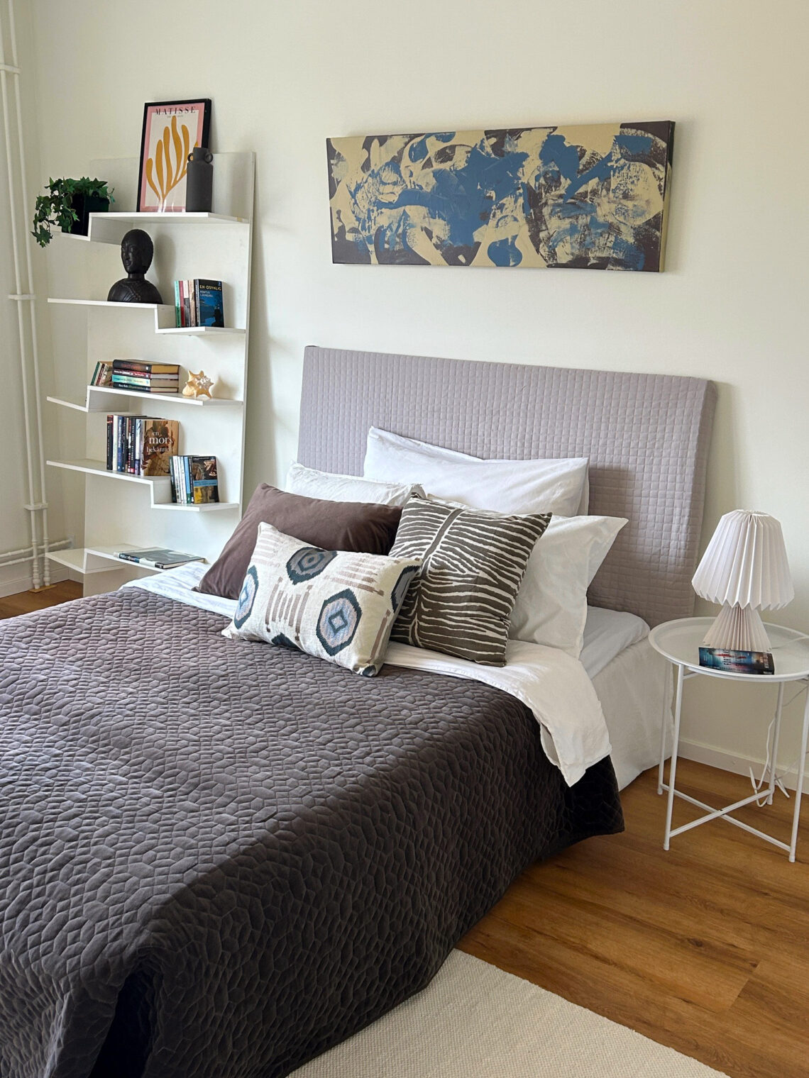 I sovrummet satte i stället kuddarna i sängen prägel på resten av färgvalen. Tavlan över sängen köpte Sanna för 150 kronor på Myrorna men hon gillade inte riktigt motivet så hon målade egna former med gammal överbliven väggfärg. En kul idé för att få spännande och personlig konst.