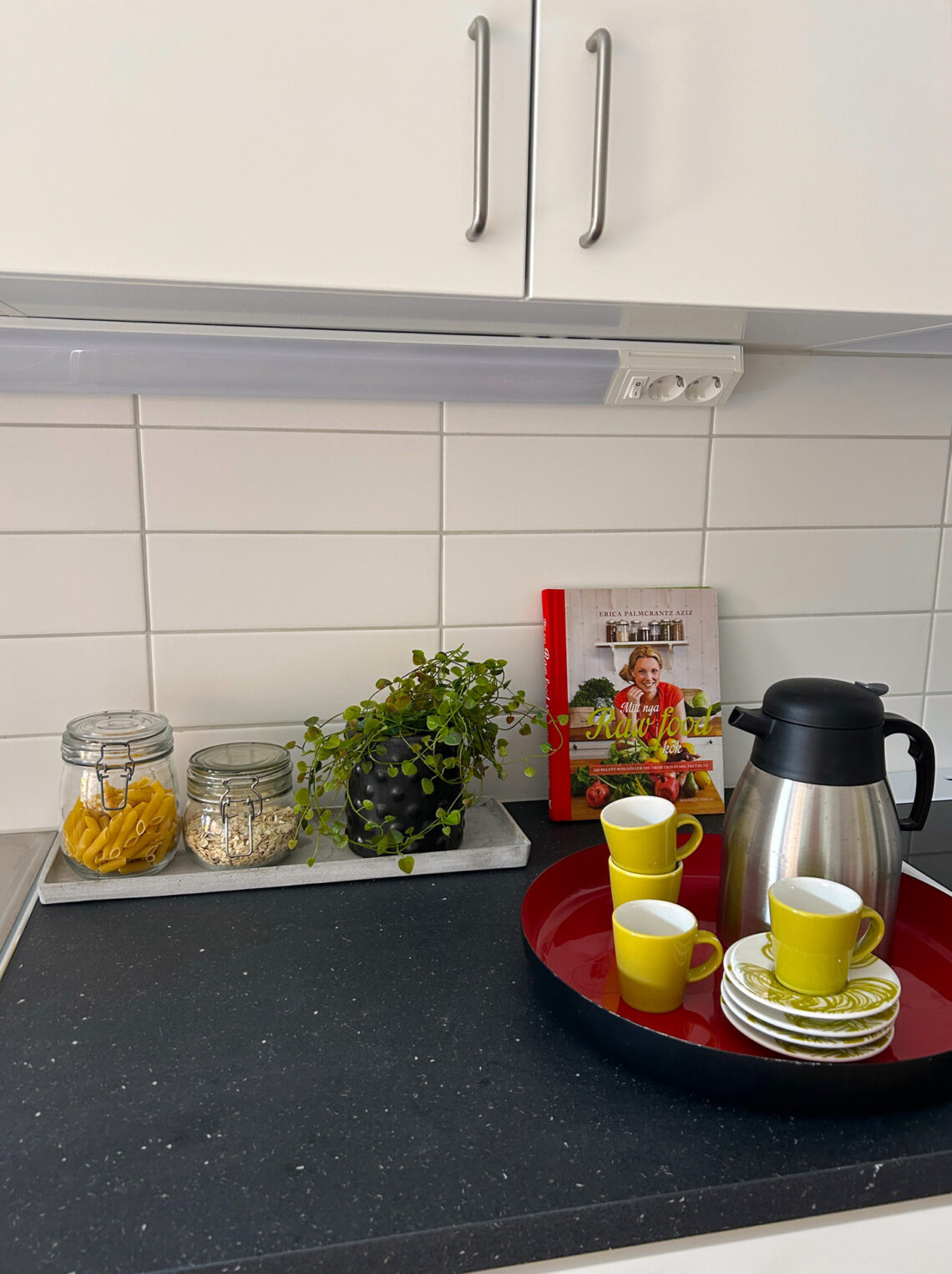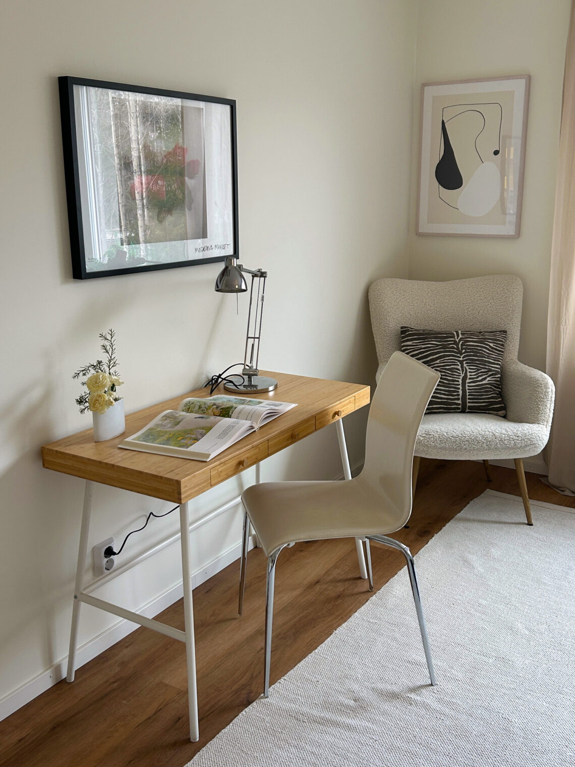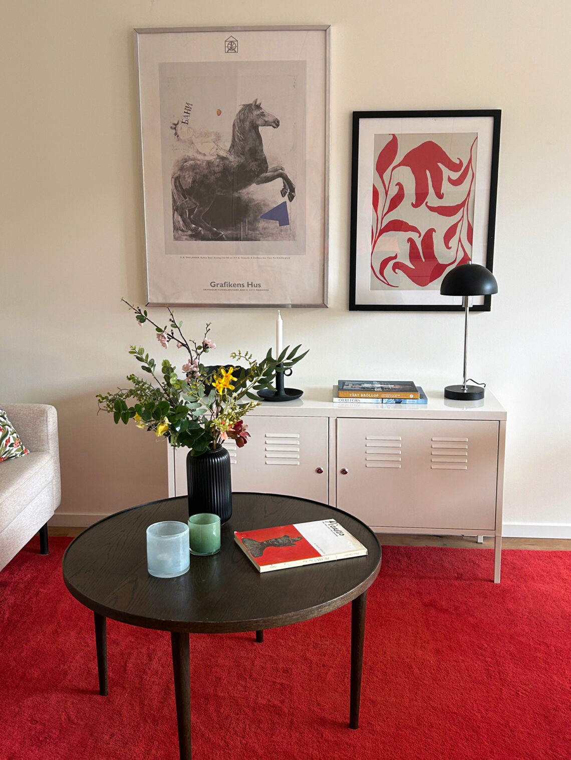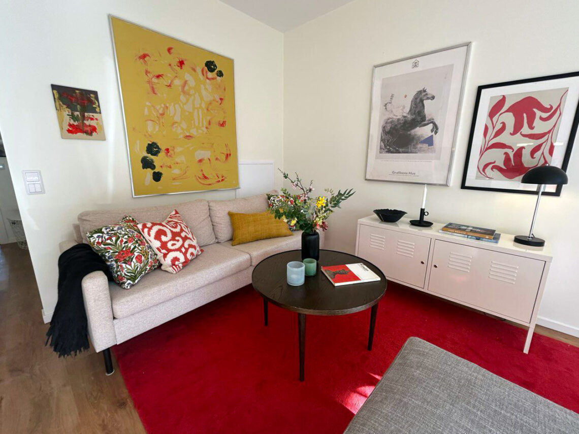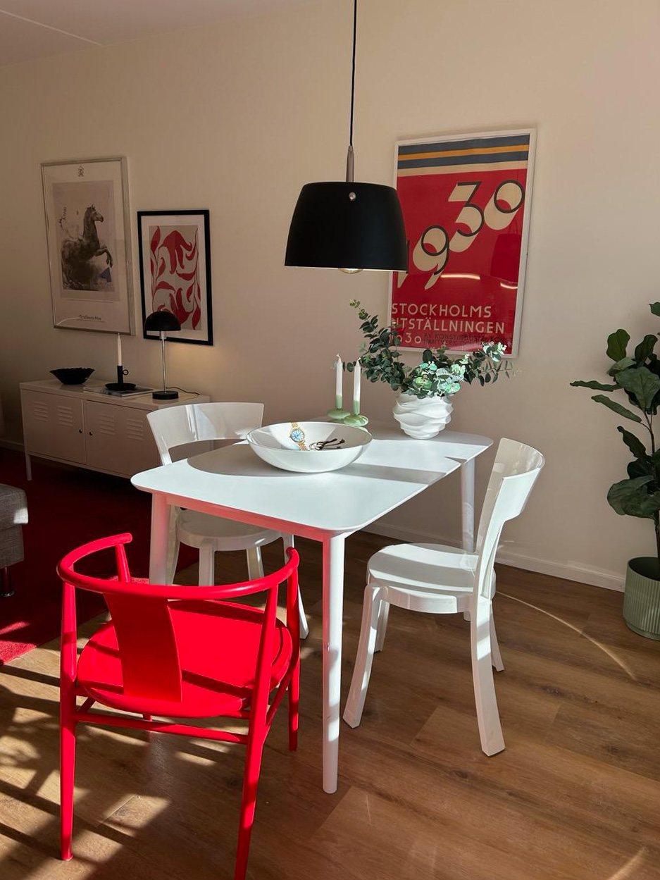 Den röda stolen målade Sanna om i samma nyans som mattan för att få harmoni och ett enhetligt uttryck i den öppna planlösningen mellan kök och vardagsrum. Den klassiska utställningsaffischen blev pricken över i:et över matplatsen.
